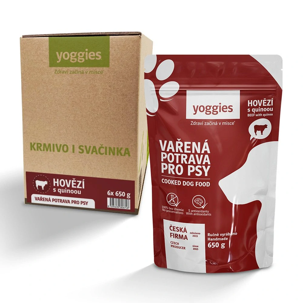 6x650g Yoggies Vařená potrava pro psy – hovězí maso s quinoou (krabice)