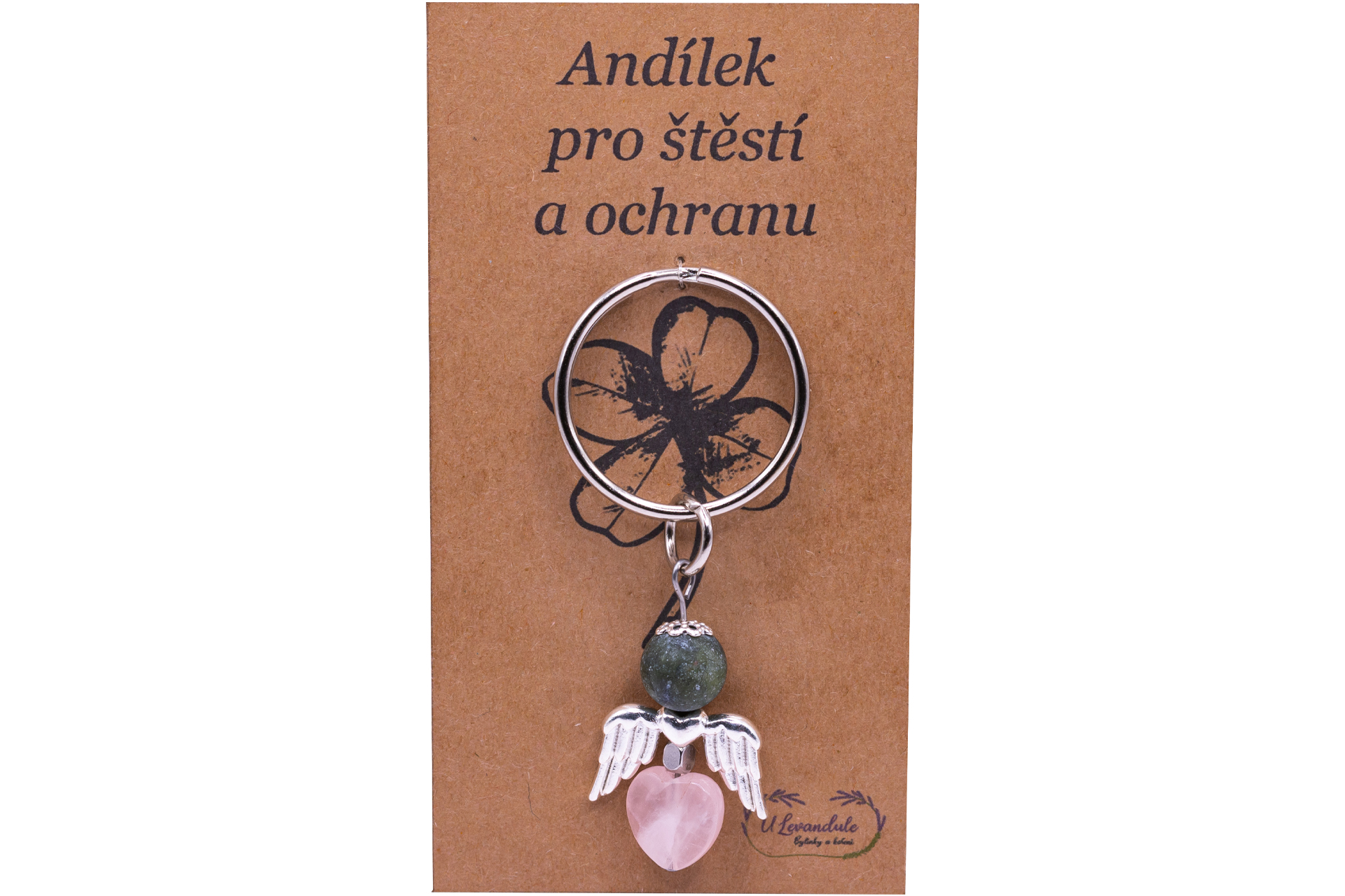 Přívěsek ve tvaru andílka, který je vyroben z přírodních minerálů - Nefrit a Růženín.